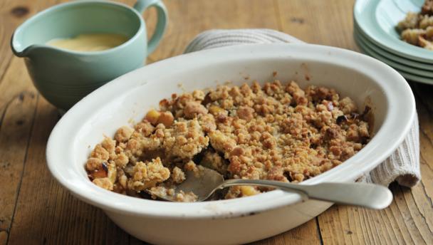 - Butter a 24cm/9in ovenproof dish. Spoon the fruit mixture into the bottom, then sprinkle the crumble mixture on top.