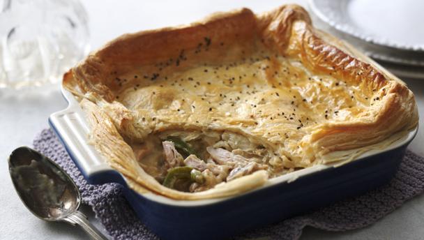 - Butter an ovenproof dish large enough to hold the chicken pie mixture with room to spare. Add the chicken mixture to the dish.