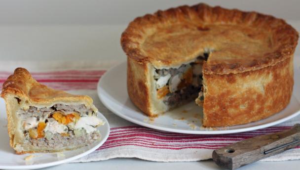 - Fill the pastry case with a layer of sausagemeat, then all the chicken and apricot mixture, a layer of potato slices and finally another layer of sausagemeat. Place the lid on top of the pie and crimp the edges to seal. Using a sharp knife, cut away any excess pastry overhanging the tin and cut a small circle in the middle of the lid for steam to escape when cooking. Brush the lid with beaten egg.