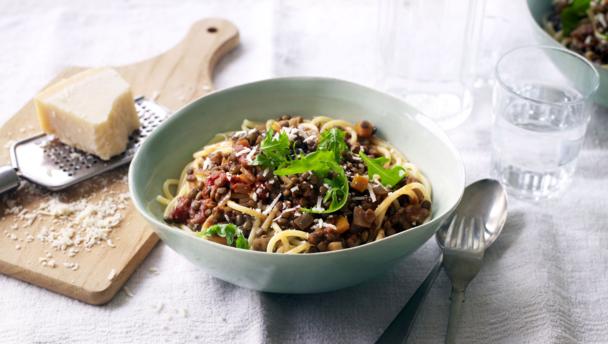- Tip the drained pasta into the sauté pan with the sauce and mix well, adding the reserved pasta water if necessary to coat all the pasta in sauce. Serve straightaway with a green salad and a grating of cheese.