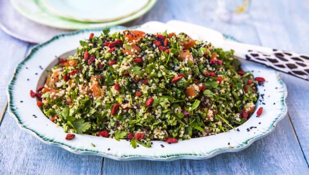 6. To serve, pile the tabbouleh on a platter, then sprinkle over the toasted sesame seeds and goji berries.
