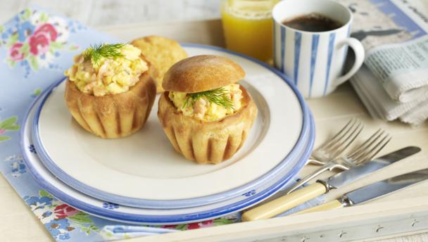- As soon as the eggs begin to solidify – after about one minute – and when you have about 50 per cent solid and the rest still liquid, quickly add the salmon and cream, then keep on stirring like mad until almost all the liquid has gone, which will take 3-4 minutes. Then remove the pan from the heat and continue stirring until the eggs become a soft, creamy mass. Taste to check the seasoning and spoon into the toasted brioche buns. Top with a little dill, replace the lids and serve immediately.